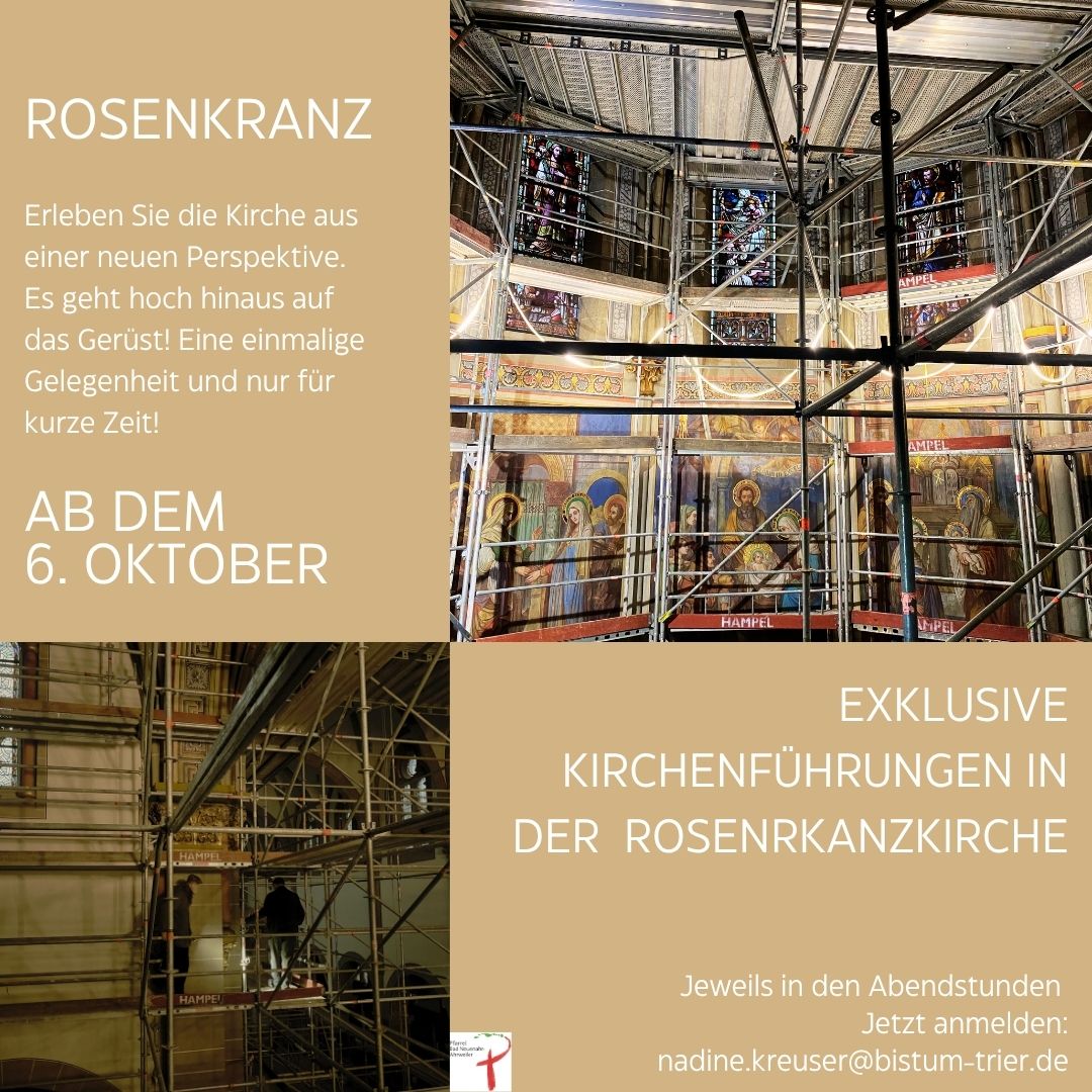 Ab dem 6. Oktober 2025 eröffnet sich eine außergewöhnliche Gelegenheit: Die Rosenkranzkirche in Bad Neuenahr-Ahrweiler kann dank des derzeit errichteten Gerüsts aus einer völlig neuen Perspektive entdeckt werden. Besucherinnen und Besucher haben die Möglichkeit, die Kirche aus luftiger Höhe zu erleben und architektonische Details zu bestaunen, die normalerweise verborgen bleiben.