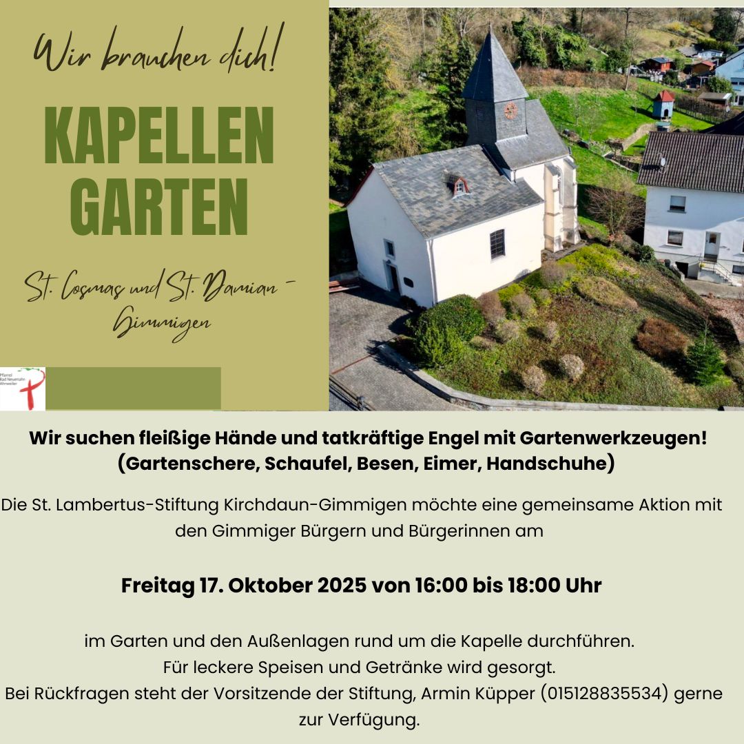 Von 16 bis 18 Uhr wird rund um die Kapelle St. Cosmas und St. Damian gemeinsam gearbeitet, gejätet und gepflegt, damit die Anlage auch weiterhin ein schöner Ort der Ruhe und Besinnung bleibt.
